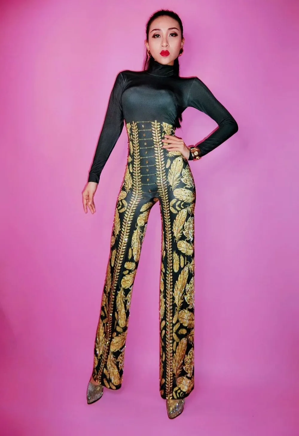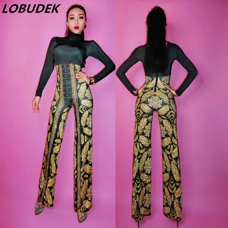 Gold Feathers Printing Jumpsuit Female Costume Sexy Sparkly Crystals Horn type Rompers Bar DJ Singe