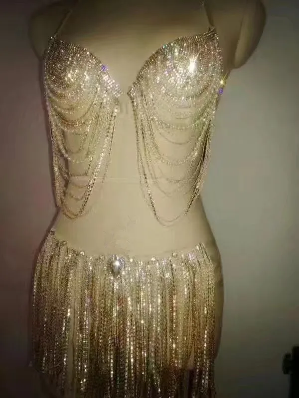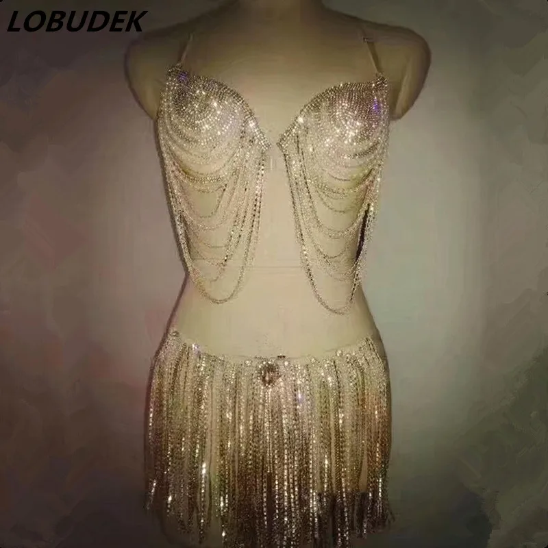 Gold Sparkly Rhinestones Tassels Bikini Female Costume Bar Nightclub DJ Singer Dance wear Pole danc